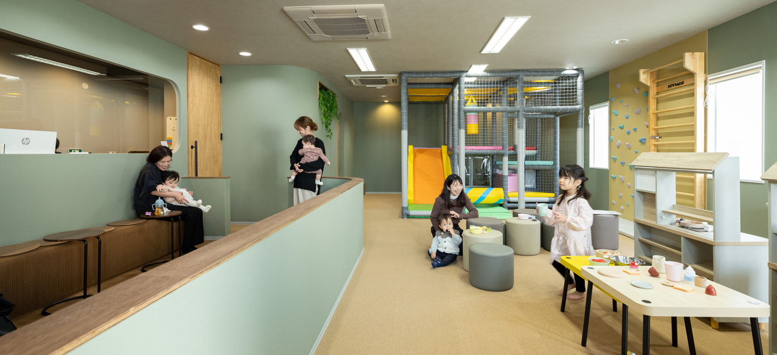 お出掛け先で困るのが、授乳とおむつ交換のタイミング。きょうだいの同時利用を想定し、ご家族全員が入れるようかなり広めに設計しています。また、一人用のゆったりソファを置いていますので、あぐらをかいてラクな姿勢で授乳できます。くれぐれも腰痛にはお気をつけください。